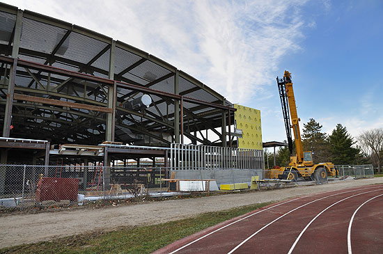 View of the field house from the track, looking west. Each of the 14 trusses in the field house weighs approximately 83,000 pounds.