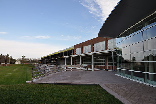 Looking north along the loggia toward the west side of the field house. The football field is in the left of the photograph.