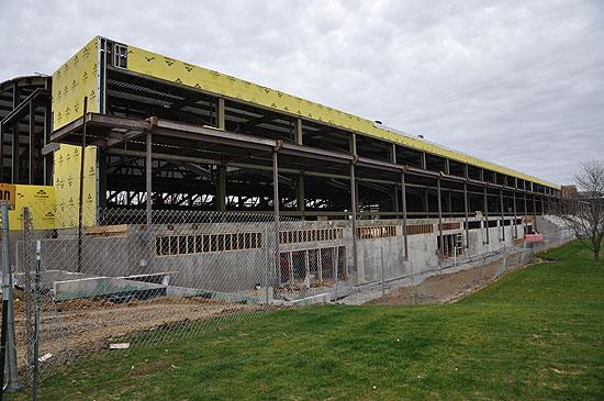 West side of the field house, north end. The top of the cement wall marks the top of the loggia, which extends the length of the field house.
