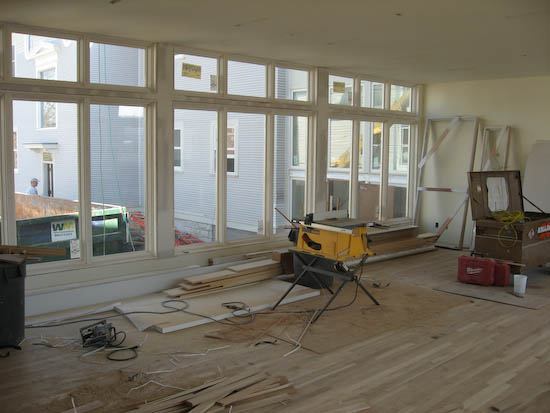 Prev · Next First floor conference room looking southeast with a view of the north entrance and hardwood floor installation. This conference room will also serve as a seminar room. It will be furnished with whiteboard and wall-mounted monitor and computer. A table salvaged from the old Carnegie library will serve as the seminar table. |